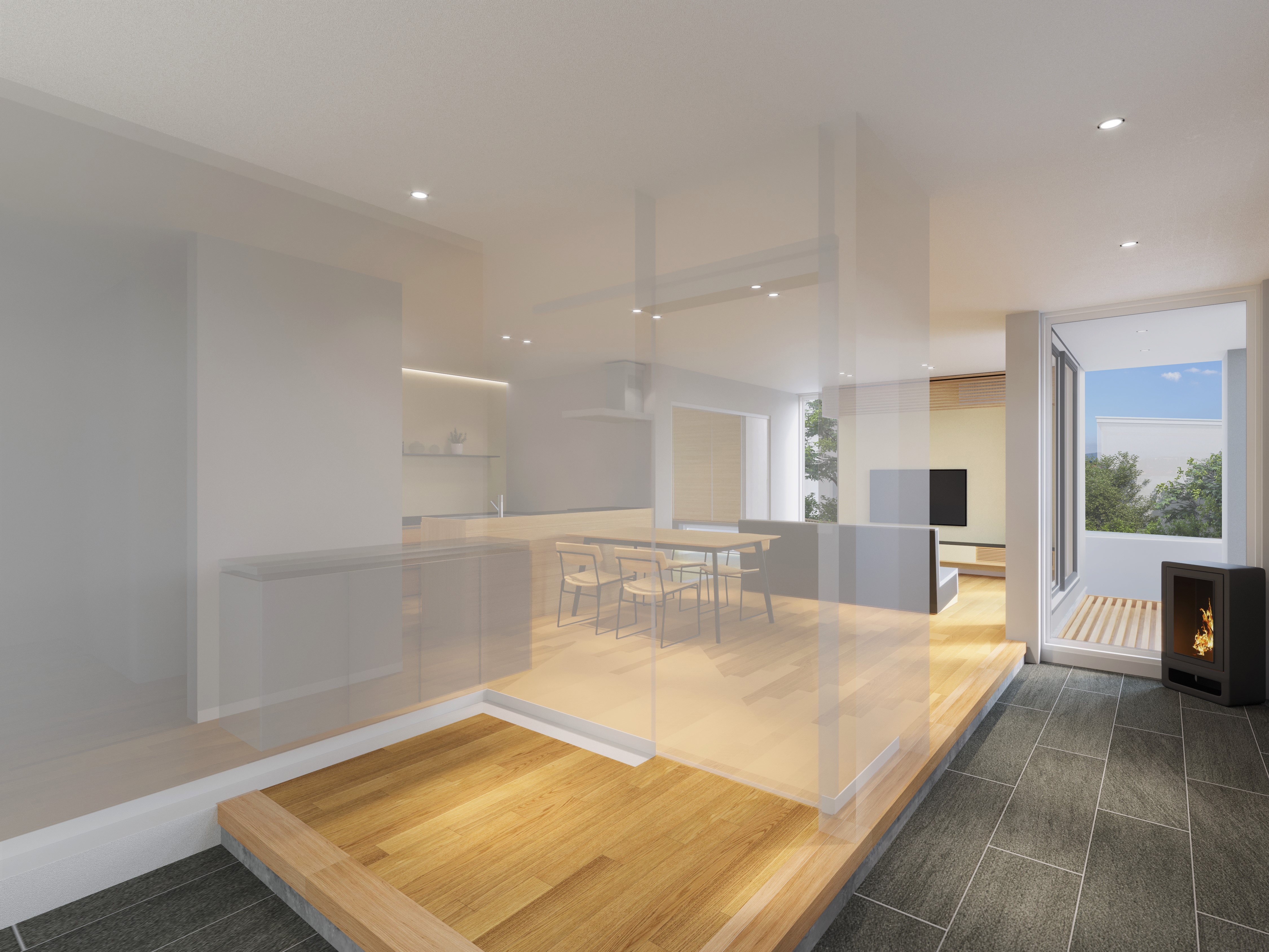 ペレットストーブ、外と中を繋ぐ土間空間は