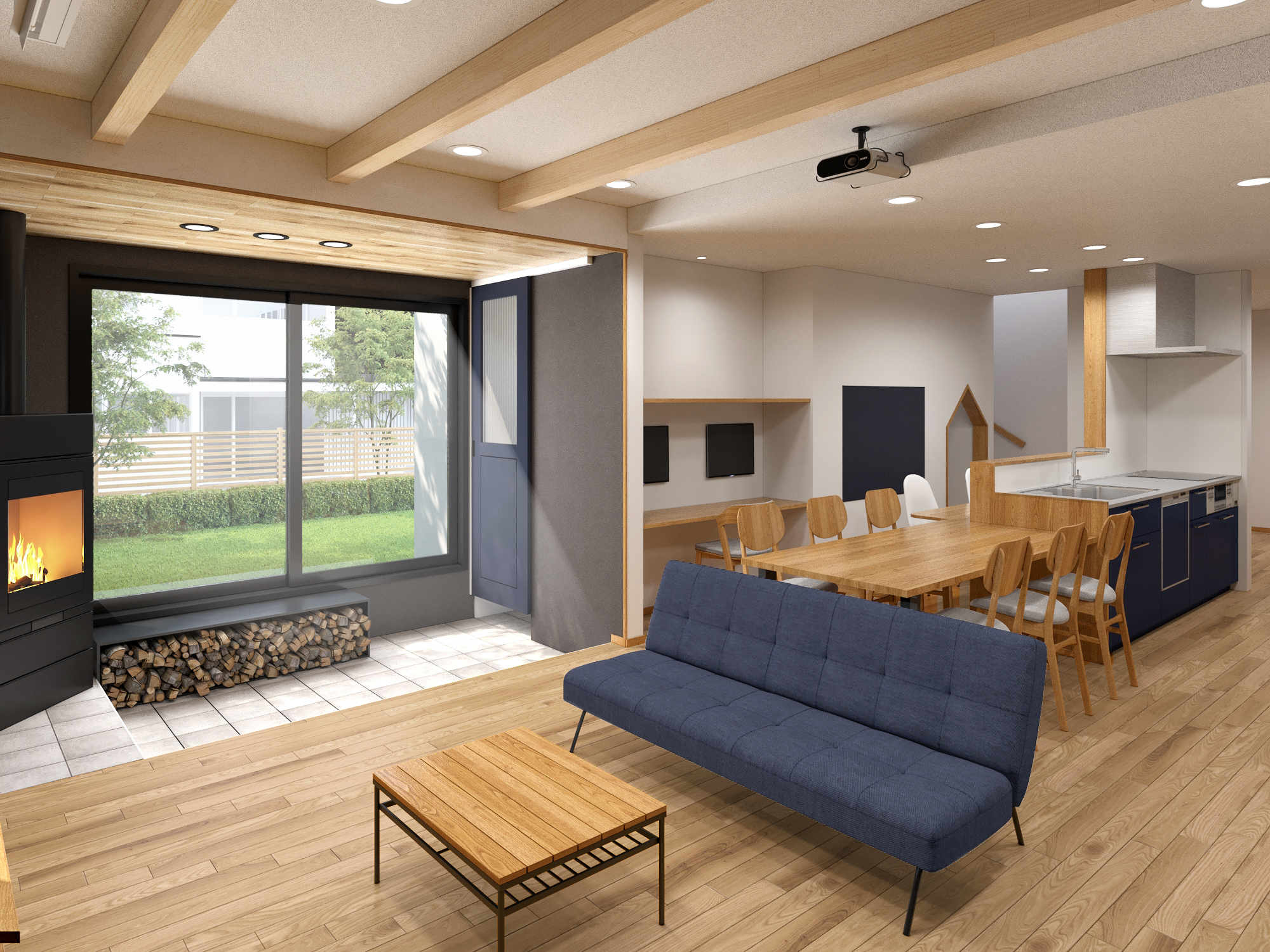 ペレットストーブがあり、お洒落で暖かい雰囲気に包まれたデザインと木の質感を損なわないよう工夫しながら制作いたしました。
